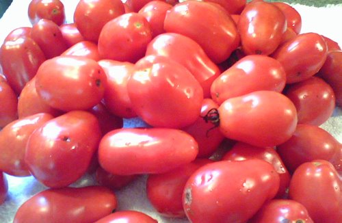 Starting now on the Tomato Jalapeno Jam with about 5 pounds of Roma tomatoes, waiting in line to have their skins removed.