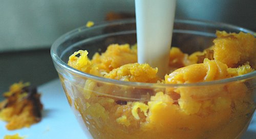 Once cool, use a large soup spoon to scoop out the flesh, being careful not to get any of the skin. Squash skin is not very tasty, so if you accidentally scoop too hard and get some mixed in, pick it out. The caramelized cut surface of the squash is really good though, so make sure you get that too.