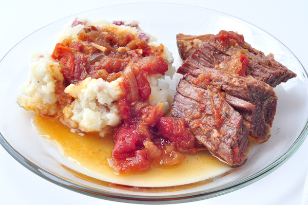 You can cook vegetables right in with the roast. Potatoes, carrots and rutabega are our favorite – they will take about 40 minutes to get done, so plan accordingly. With this particular roast though, I like mashed red skin potatoes. I don’t thicken the gravy either – just ladle a bit of the juices and tomato chunks over the meat and potatoes. You could plop a little pat of butter on the potatoes too, if you are so inclined – which I usually am.