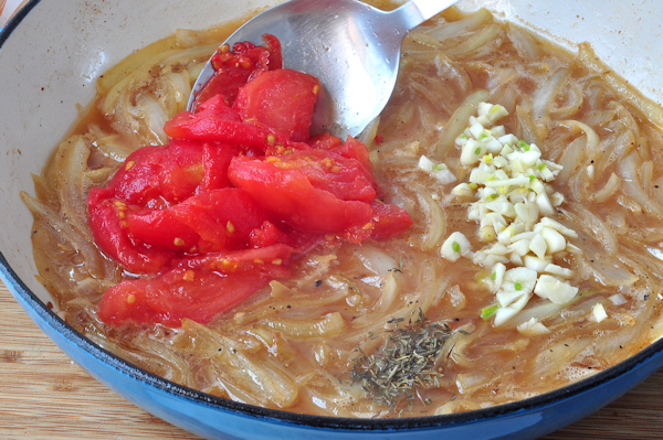 Now, add the tomatoes, garlic and thyme. These tomatoes are from our garden – tucked into the freezer, during the great Tomato Masacree of 2010. I measured and this is about 30 ounces, but canned tomatoes come in 28 ounce cans, so that much will work just fine. If you buy whole canned tomatoes, you can cut them up a bit if you like – I do it right in the can with either a slender bladed knife, or a pair of kitchen shears. Use about half of the garlic, saving the other half to add after a couple hours. The amount of thyme is up to you – I use at a least a heaping teaspoon. This is the last of what I dried from my herb garden last fall – if I had some fresh, I would use that – a couple good sized sprigs. Also, sadly, that was the last head of our garlic too – sob! [is it time to plant the garden yet?] Add another generous pinch of salt and some fresh ground pepper.