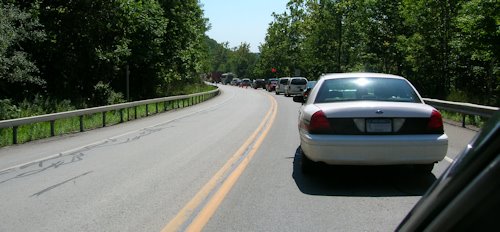 Drive another 5 miles and you approach the real deal. Construction zone three looks a little more extensive. Their sign is metal for starters. One disadvantage of not driving into town very often is that you forget that they are repaving a big stretch of road where it is impossible to construct a detour. This does not look good. Not only is there a long line of cars, but no one is coming from the other direction either.