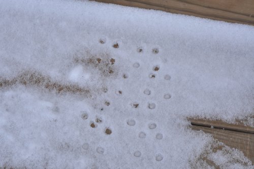 Then yesterday, when we came home from church, we noticed some strange looking prints in the snow on the porch steps – they seemed to go up and then back down again. Some small rodent or maybe a new bird species I thought.We came in and had lunch and as I was enjoying a fresh cup of coffee, I caught sight of some movement up near the road. It reminded me of something I had seen before. I grabbed my camera and ran up to the road to see what was going on. Look who I found! My old friends Fred and Bessie!